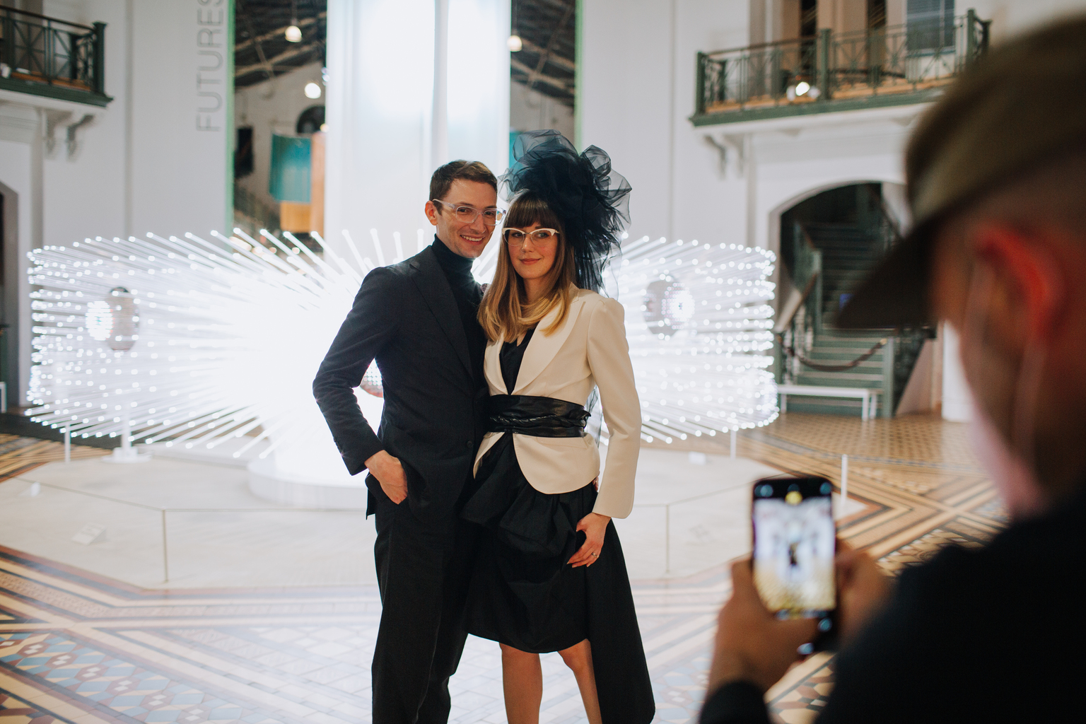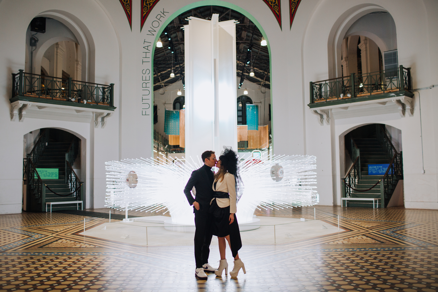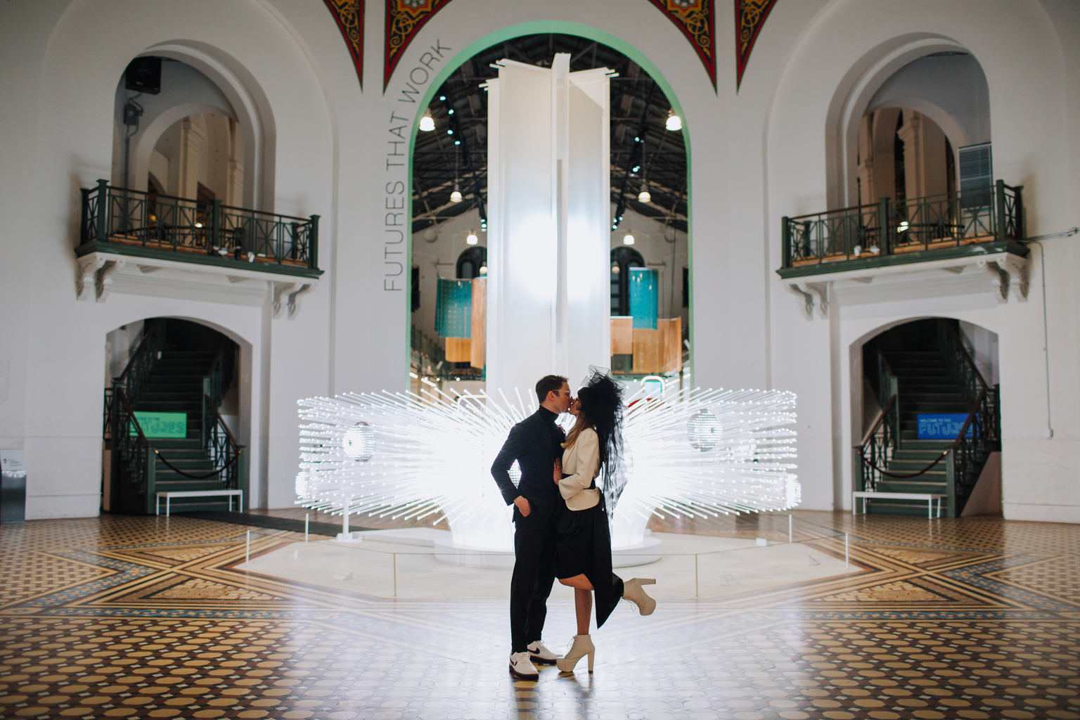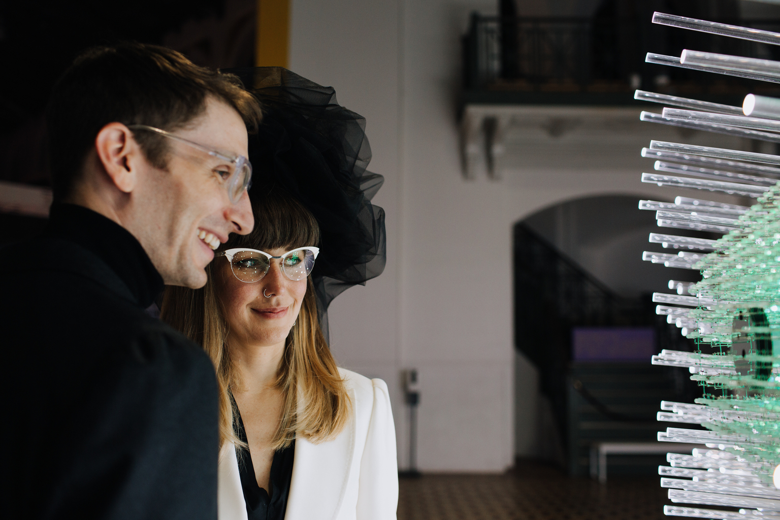 Justin had collaborated with Suchi for 18 months on the technology inside the sculpture, which had just launched at the historic Smithsonian Arts + Industries building. Dawn had the idea that we could embrace the spirit of Me + You (and the larger exhibit called "FUTURES"), which was meant to imagine positive futures between humanity and technology. The sculpture responded to visitors' spoken input of "My future is ______" with a one-of-a-kind lighting animation. We took this opportunity to declare our love and commitment to each other by saying "My future is Dawn" and "My future is Justin". This was our modern version of saying "I do" in a unique and beautiful setting.