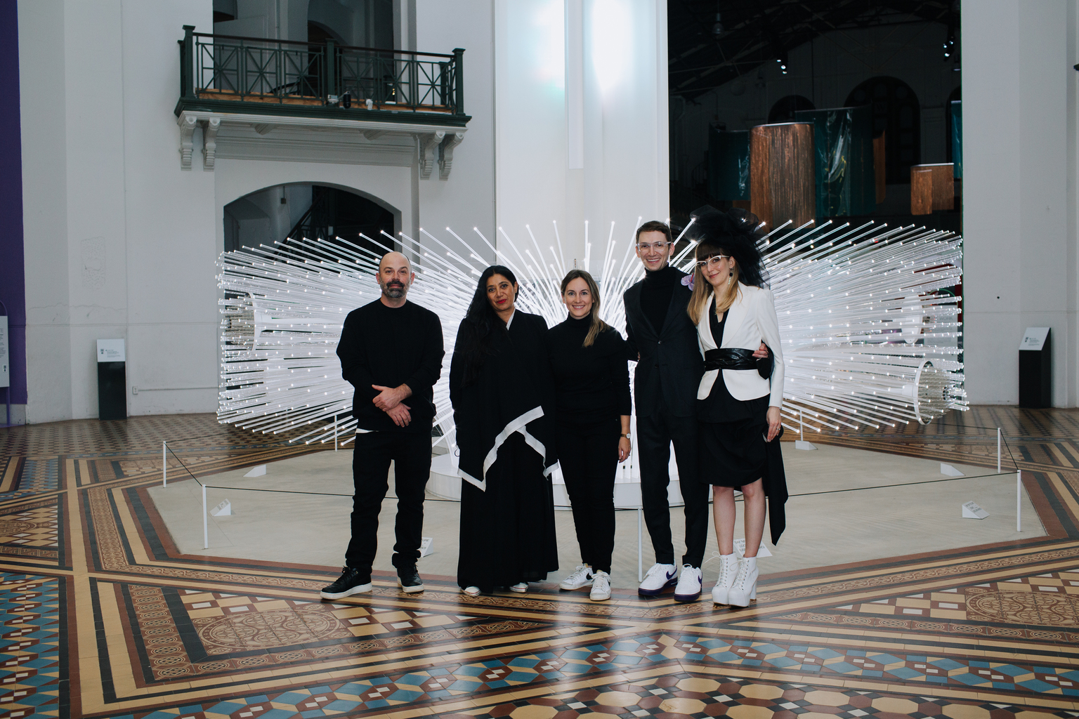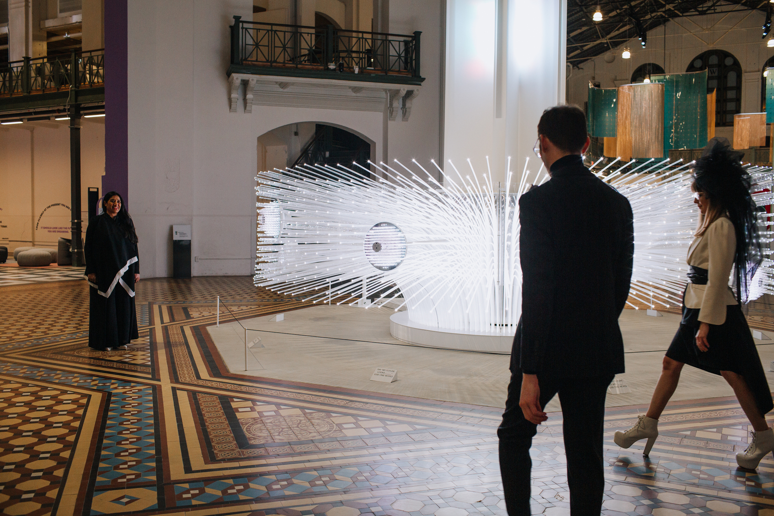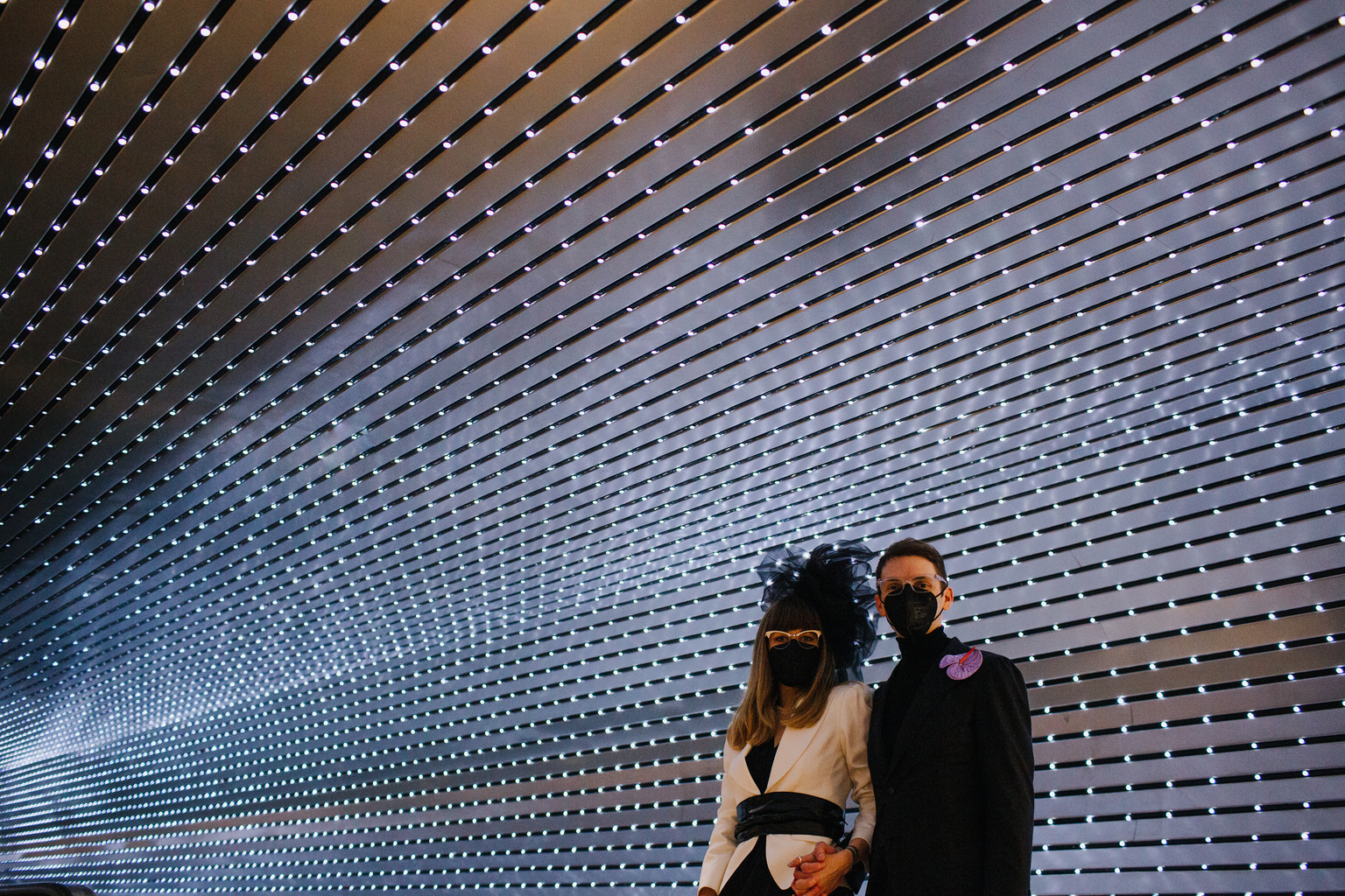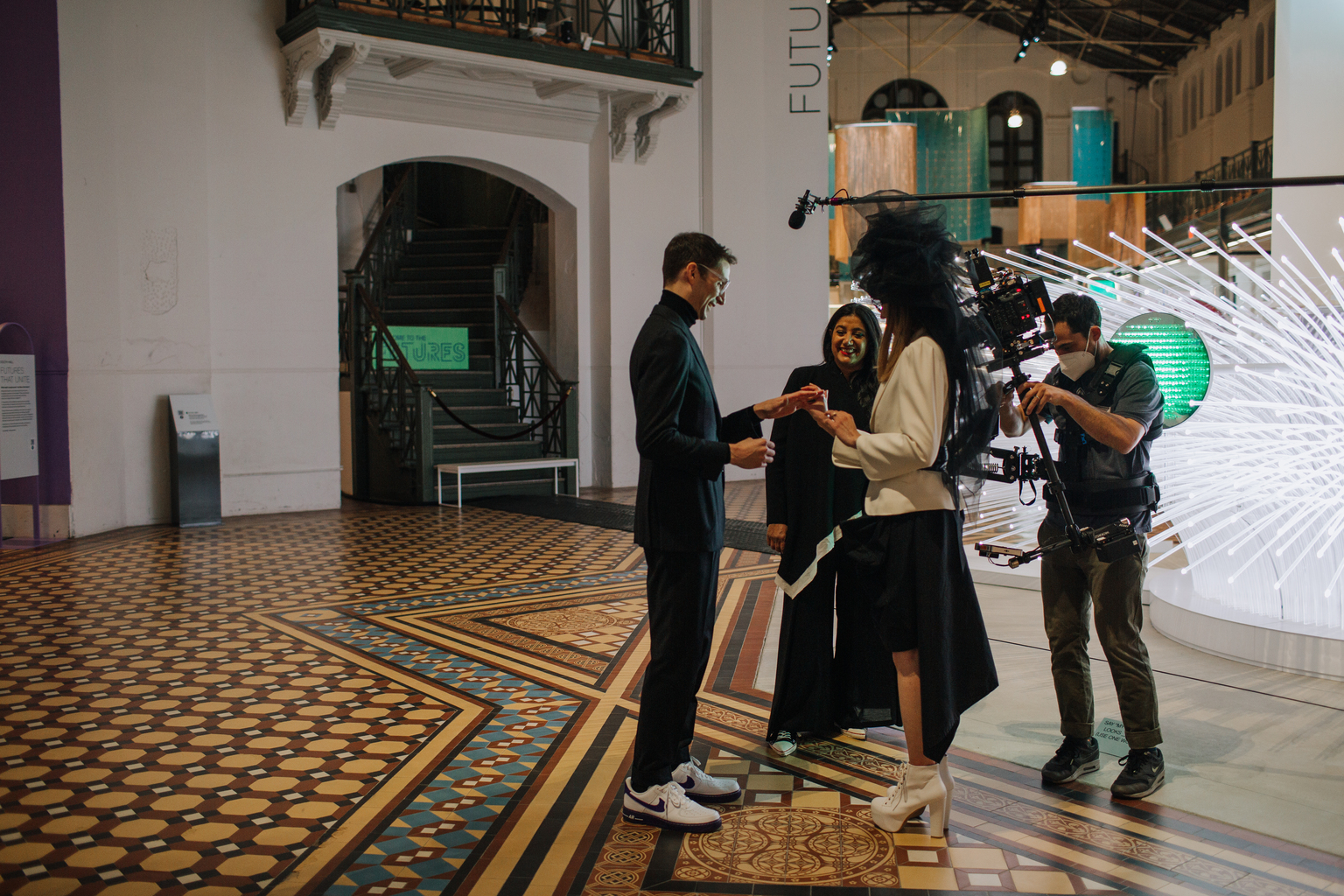 Justin had collaborated with Suchi for 18 months on the technology inside the sculpture, which had just launched at the historic Smithsonian Arts + Industries building. Dawn had the idea that we could embrace the spirit of Me + You (and the larger exhibit called "FUTURES"), which was meant to imagine positive futures between humanity and technology. The sculpture responded to visitors' spoken input of "My future is ______" with a one-of-a-kind lighting animation. We took this opportunity to declare our love and commitment to each other by saying "My future is Dawn" and "My future is Justin". This was our modern version of saying "I do" in a unique and beautiful setting.